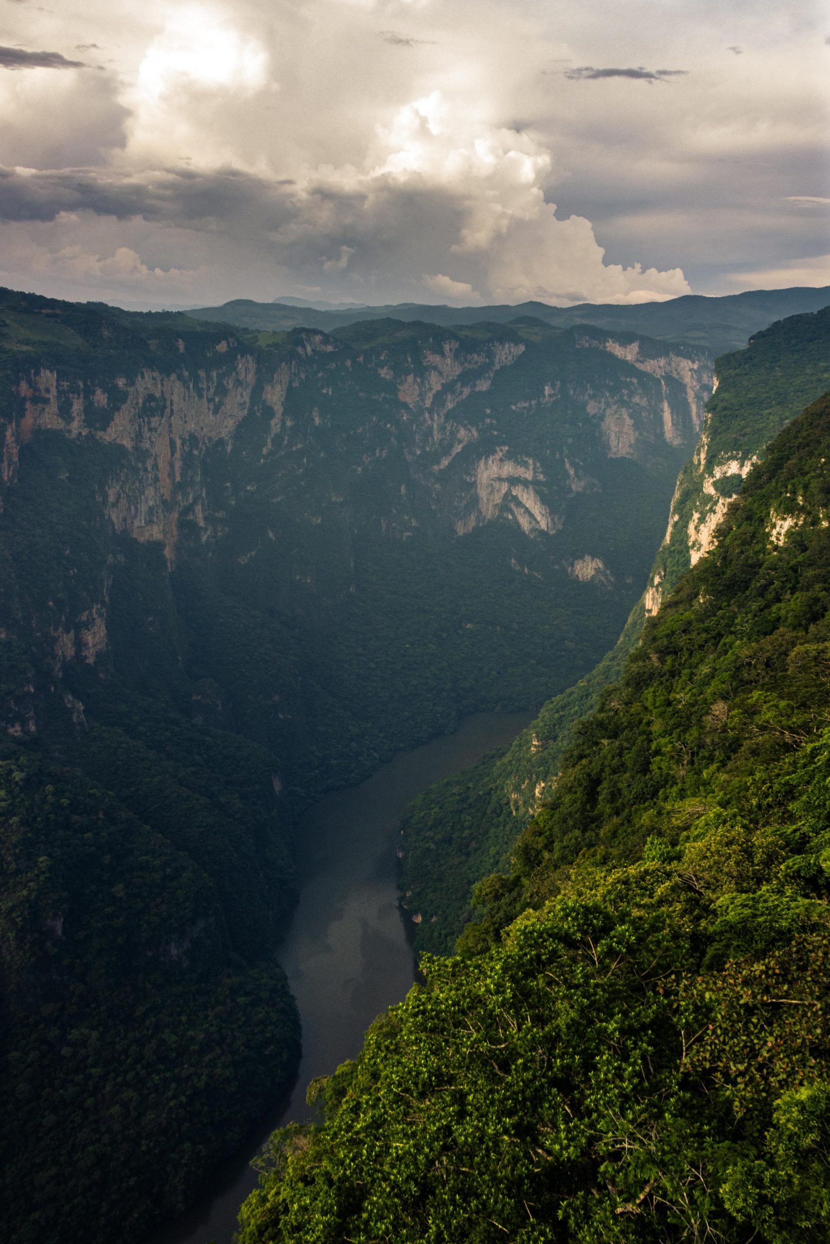 El Cañón del Sumidero es una falla geológica que atraviesa un Parque Nacional de 28 mil hectáreas, del mismo nombre, distribuidas en selvas alta, mediana y baja con una diversidad de especies de vegetación y árboles como el pino y el encino que conforme cae la tarde este viernes se revisten de sombras cual señal para las visitas de que es hora de marcharse, pues el sol ha ido perdiendo fuerza ante la presencia de más nubes grises y oscuras y la caída de niebla sobre el Cañón.