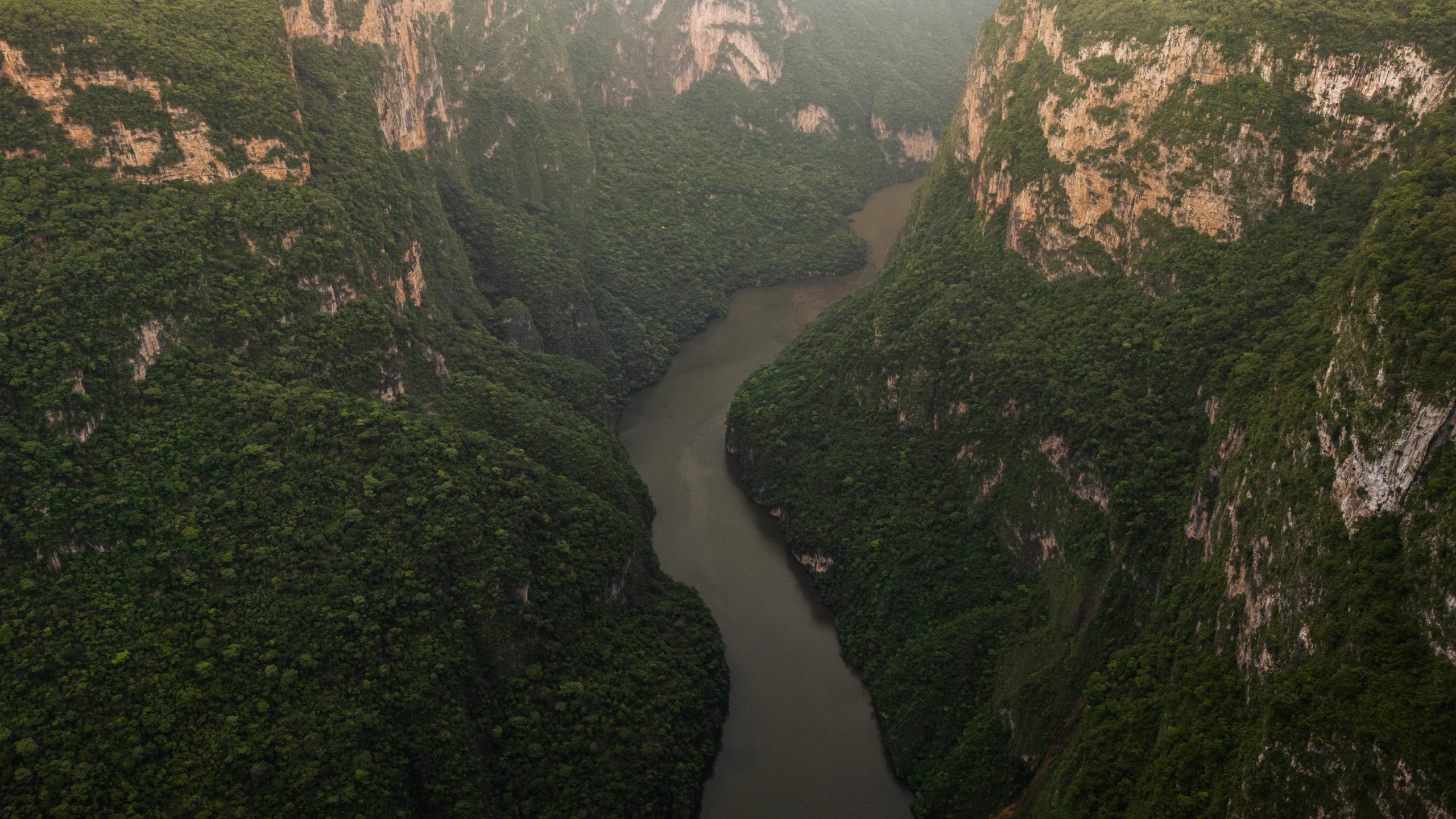 De color platino se observan desde estas alturas en su extensión las aguas del río Grijalva que a lo largo de los 30 kilómetros del Cañón del Sumidero conforman el embalse de la presa Chicoasén, mientras el sol cierra la tarde con sus coloridos destellos ya sea sobre el agua, sobre la altas paredes, sobre la verde naturaleza de la que hacen parte cientos de especies de flora y fauna como el cocodrilo de río, como el mono araña, el águila pescadora y la diversidad de mariposas que revolotean posando aquí y allá con sus colores.